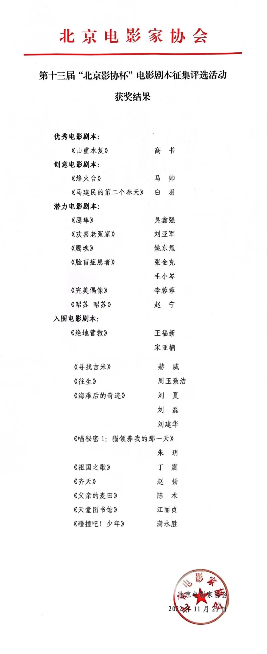 第十三届“北京影协杯”电影剧本征集评选活动评选结果