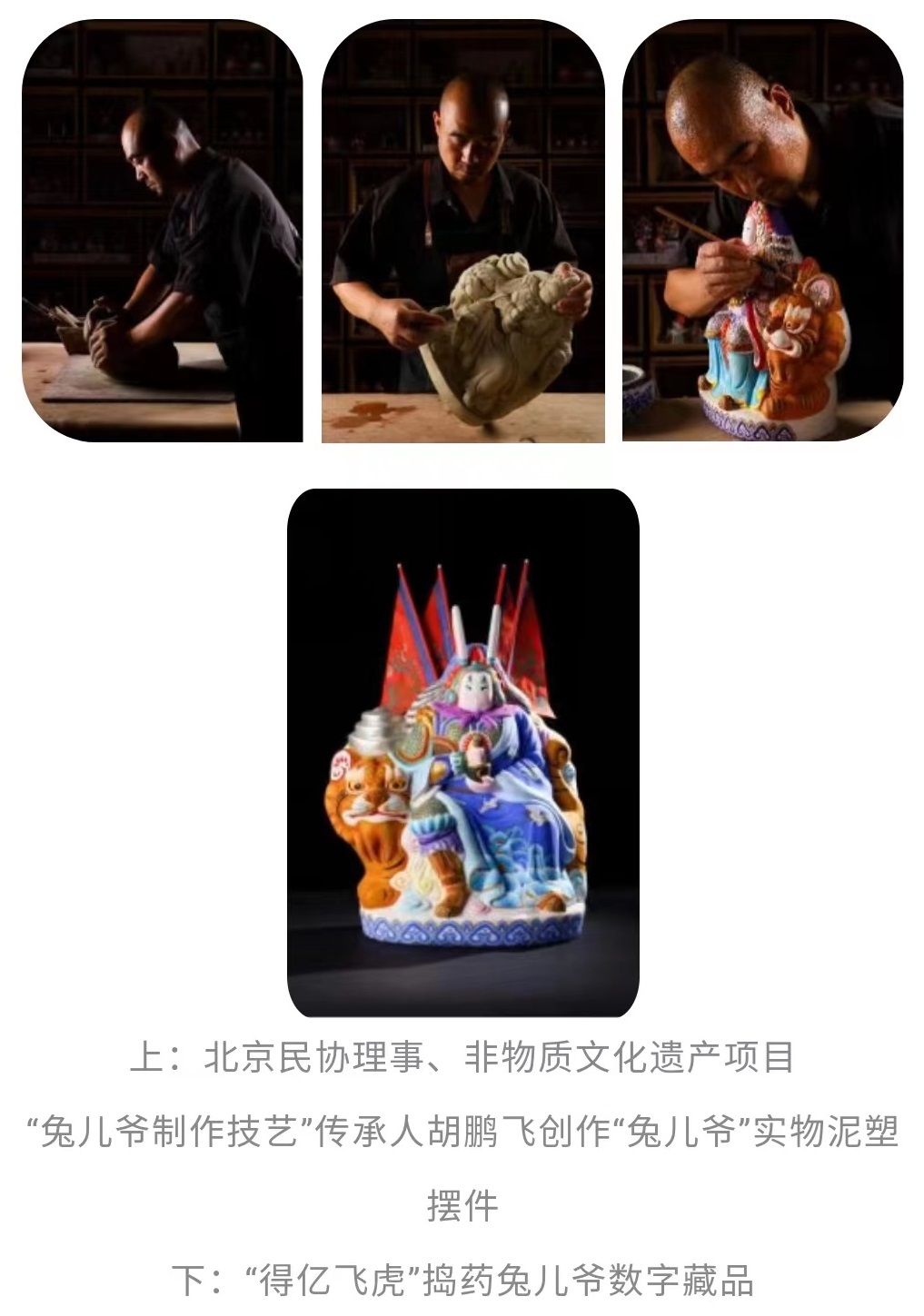该系列数字藏品包含老北京非遗泥彩塑“得亿飞虎”捣药兔儿爷以及以吉兔坊原创非遗IP为原型的“心愿萌神”动态福画两组藏品,凝聚着吉祥祝福与非遗数字体验,希望用特别的方式将吉祥美好的祈愿送给每一个人。