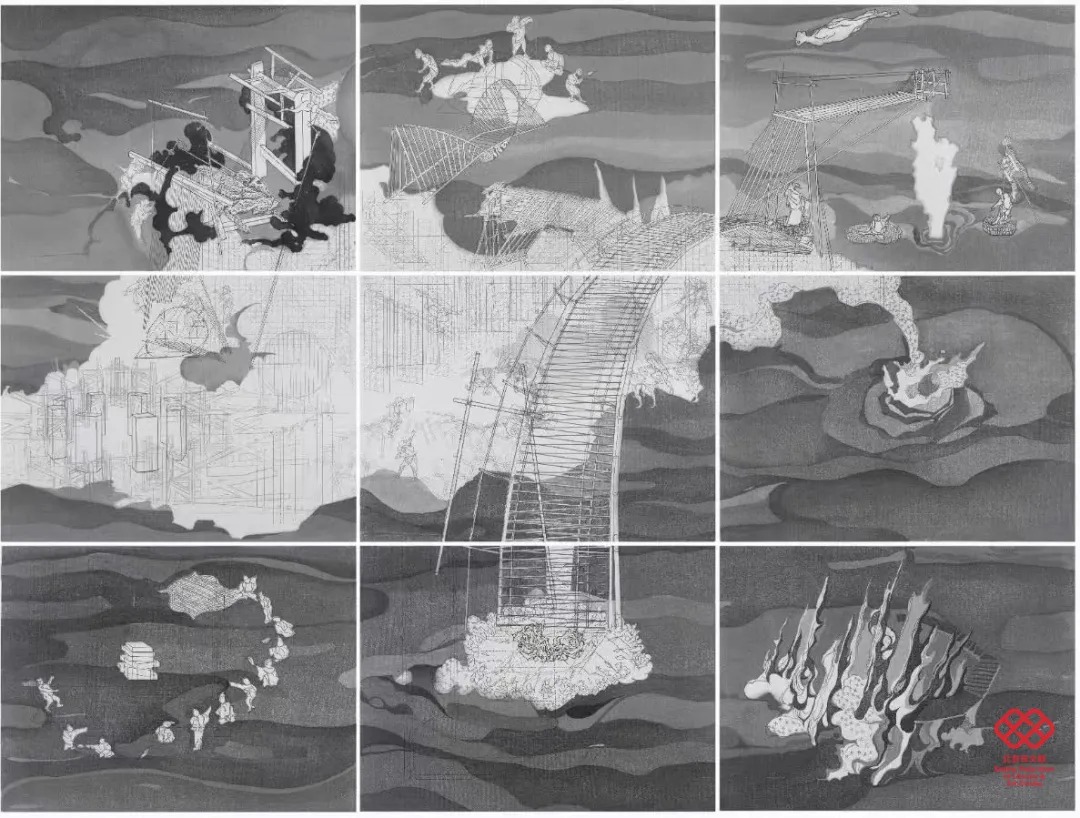 版画《筑桥》(135cm×180cm),作者:王启凡