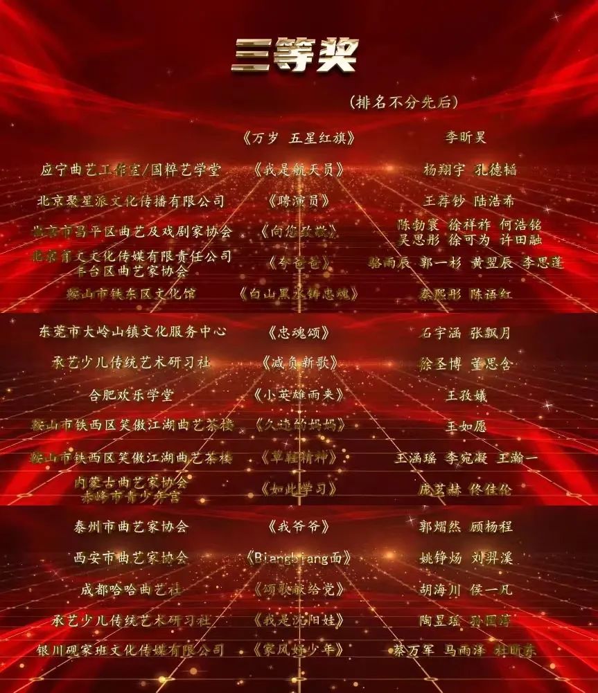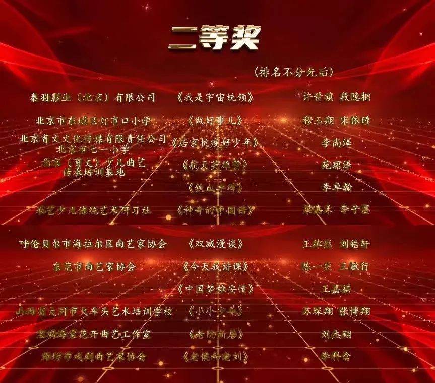 本届比赛的参赛作品,数量和质量有明显提高,助力挖掘新生力量,形成阶梯式人才储备,为不同年龄段热爱曲艺艺术的孩子们提供了专业展示的平台,引导孩子们树立正确的人生观、价值观、世界观,传承曲艺人精益求精、积极向上的匠心精神。