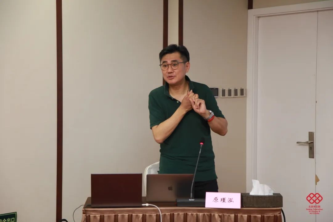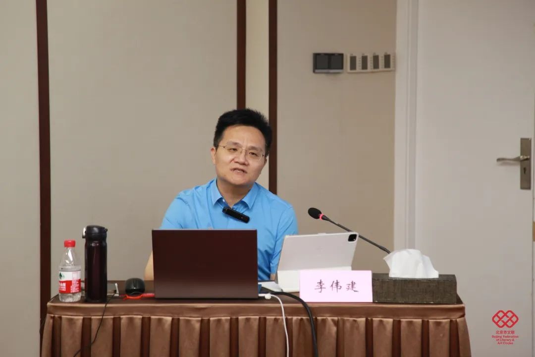 北京市文联副主席、北京曲协主席李伟建,以《画面性是曲艺表演艺术的魅力所在》为题,讲授了中国演剧体系、曲艺是大写意的表演、口语造型、观众的心理、如何借鉴戏剧表演的内外部动作等内容,强调曲艺演员要通过绘声绘色的描述,使观众产生画面感,从而引起观众的共情、共鸣、共“谋”,共“谋”就是与观众共“谋”一事,演员要带着观众一起走,达不到共“谋”,就无法产生共情与共鸣。