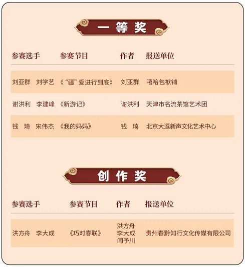 9月1日,比赛颁奖暨优秀节目展演活动在吉祥大戏院举办。展演回顾了北京青年相声节十五年历程,对获奖选手进行表彰,并邀请相声名家与获奖选手同台献艺。由李寅飞、杨广业、李涵、周宇表演的群口相声《经典咏流传》,以一人打快板、四人合说的形式,拉开了展演序幕。刘亚群、刘学艺的作品《“疆”爱进行到底》讲述毕业大学生蜕变成一名优秀援疆干部的动人故事;钱琦、高鑫表演的作品《我的妈妈》刻画出一对欢喜母女的鲜活形象和两辈人斗智斗勇的日常画面;谢洪利、李建峰的作品《新游记》以全新角度讲述城市风貌和旅游现状;苗阜、王声表演的相声《学外语》金句频出;李伟建、刘伟表演的相声《AI时代》通过对人工智能机器人的刻画,讲述科技的高速发展给人民生活带来的巨大变化;李金斗、石富宽表演的相声《笑口常开》充分展现了相声艺术的独特魅力。展演活动中,相声界老艺术家与新秀交相辉映,让观众在欢声笑语中感受到相声艺术历久弥新的生命力。