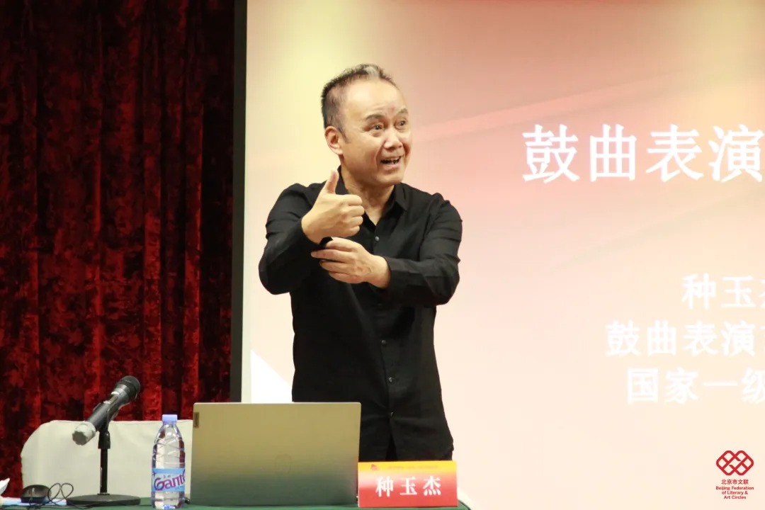 种玉杰以《鼓曲表演经验谈》为题,从北京曲剧团、北京曲艺团发展脉络讲起,分享自己从艺生涯学习演唱技巧的宝贵经验及舞台表演思路。强调吐字归音是诵说类艺术吸引观众的重要手段,要不断提高自身基本功、艺术认知及艺术鉴赏力。
