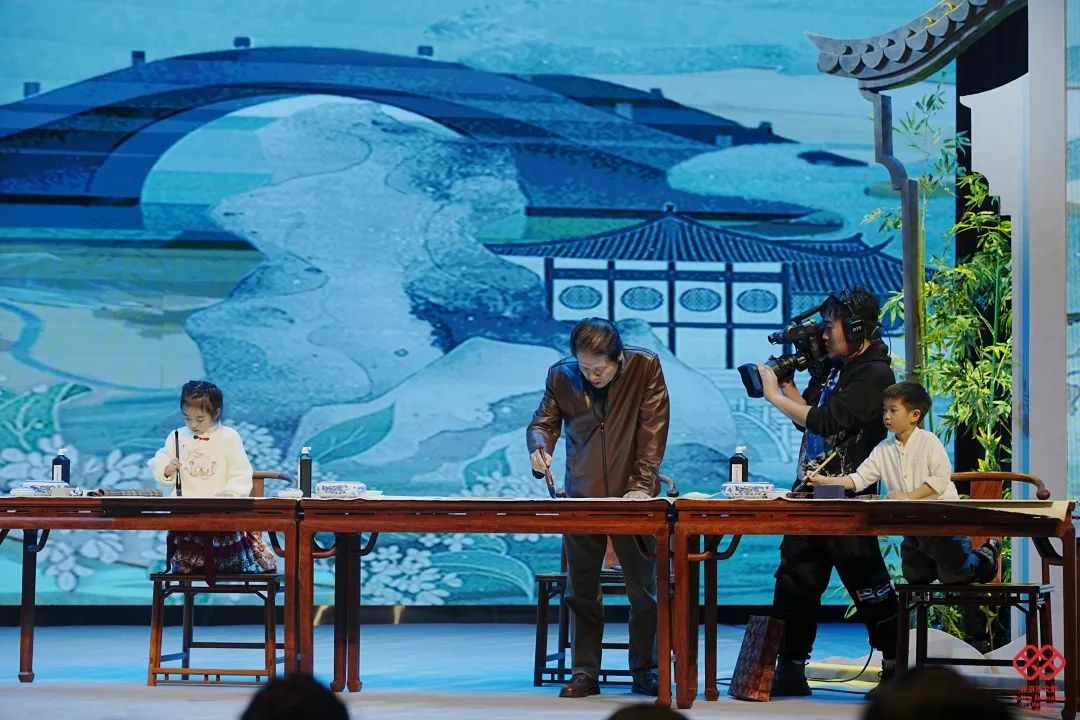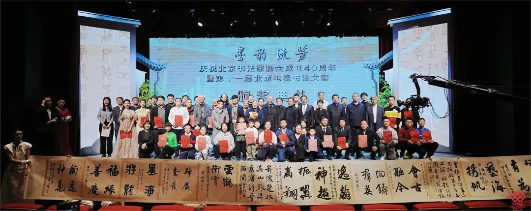 颁奖典礼现场,观众们通过短片《见证》,一同回顾了北京书协成立40年的光辉历程。北京书协的四位会员田伯平、廖廷建、王澎芊和周辰思,表演了专门为40周年创作的诗朗诵《北京笔迹》。在悠悠古琴声中,一位老艺术家带领本届大赛参赛年龄最小的两位小朋友进行了现场书法创作,相声演员李寅飞和叶蓬带来了相声《笔墨春秋》。这些精彩的节目,将书法与文艺演出完美结合,让大家沉浸在浓郁的文化氛围中,享受了一场文化盛宴。颁奖典礼最后,本届主席团的13名艺术家,为庆贺北京书协成立40周年,特别创作了书法长卷,献礼40周年!