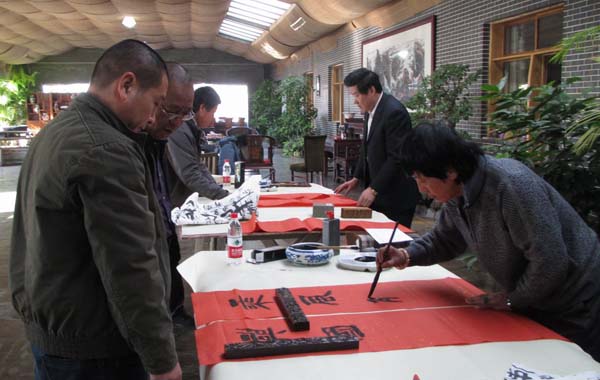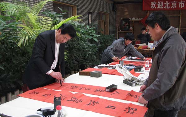 为深入学习贯彻党的十八大三中全会精神,进一步落实市文联关于“送文化下基层”的指示精神,北京书法家协会一行十余人不惧雾霾和寒冷,于2013年12月30日上午,驱车数十公里,来到通州小务村利海田园种植基地,用书写春联的传统形式向广大农户宣传党的群众路线教育和送去节日的庆贺,同时,也拉开了首都书法家下基层送春联的序幕。