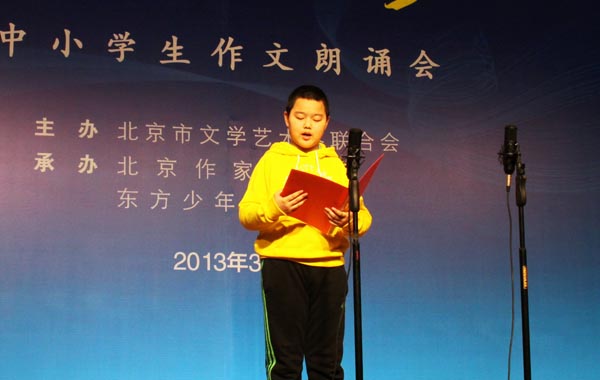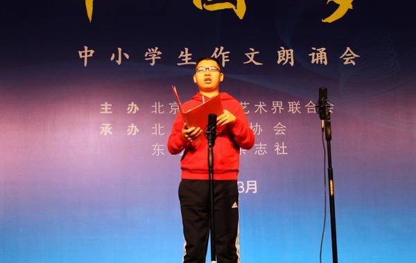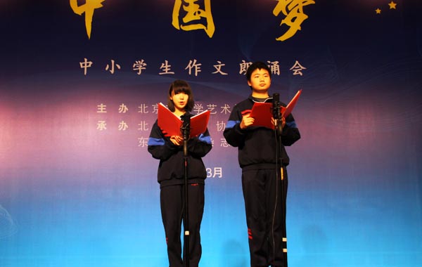在春暖花开即将到来之际,在这“两会”清风徐徐、“中国梦”送爽的喜庆日子里,3月10日上午,由北京市文联主办,北京作家协会、东方少年杂志社承办的青少年朋友的一场盛会:“东方少年·中国梦”——中小学生作文朗诵会在北京文联剧场举行。