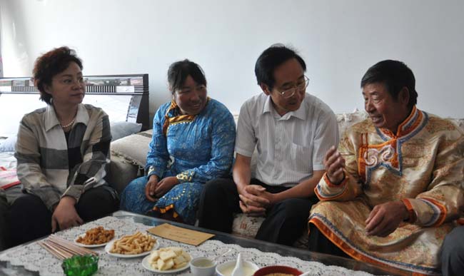 北京市文联党组书记陈启刚(右二)走进牧民家庭,与牧民聊家常。