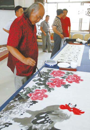 今年60岁的画家吴进良笑言,虽然这次旅途奔波未免劳累,但是“收获颇多,不虚此行”。在刚刚过去的6月份,曾跟随北京市文联赴西藏开展文化交流和采风活动的他,这一次同样专门抽出时间,把躬身实践的艺术精神带到了内蒙古,用他手中的相机和画家敏感的视角记录了这次交流之旅的精彩瞬间。在最后一场笔会中,他以最喜爱的大公鸡和牡丹为题材,画了幅《大吉大利富贵图》表达了对草原兄弟的祝福。一遍一遍用心地调色、描画细节,其对艺术作品负责的态度令内蒙古书画家赞叹不已。“重视、支持、提高、双赢”8个字是吴进良总结的北京市文联多年来坚持走转改的个人感受。他说:“艺术来源于社会,最终要还原于社会,给社会和人民增加美感。这次,北京市文联组织如此庞大的艺术团来到内蒙古,坐下来给当地百姓演出、作画,是很了不起的。而他作为一名画家能够参与其中,为基层百姓奉献自己的力量,非常荣幸。”