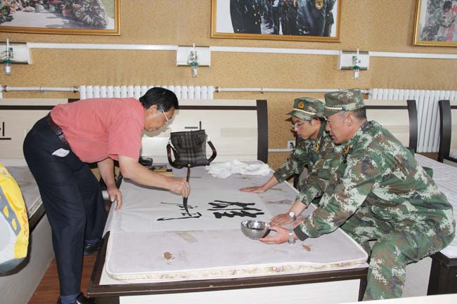 没有桌子,书法家王献坤在红其拉甫哨所营房内的床铺上创作