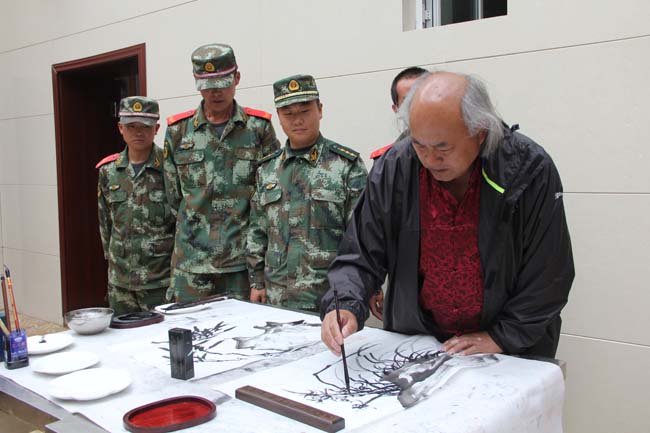 这厢演员们的演出获得良好反响,那厢书画家们的笔会交流也进入佳境。吴进良、张建豹、柳妍、陆海艇、谭军立、王献坤、方放、刘贞亮、田忠利等书画家们挥毫泼墨,与当地的书法家和书法爱好者以墨会友,交流技艺。吴进良创作的一幅《雪域昆仑》引得众人纷纷驻足,画家以雪、竹入画,呈现出高洁挺拔之感,吴进良说之所以创作这样一幅画作,是因为看到驻守边疆的战士们深有感触,也借此对他们扎根边疆的奉献精神表示敬意。和田地区文化馆馆长、兵团十四师美协主席曹建斌与北京的书画家共同创作了一幅《吉祥满园长寿图》,他表示很高兴也很荣幸,“通过交流学到了很多,画艺有所精进了”。让他更为高兴的是,当地画家以前多画油画,通过这样的交流现在不少画家也开始学画国画了,“这是个喜人的现象”。