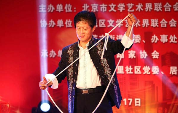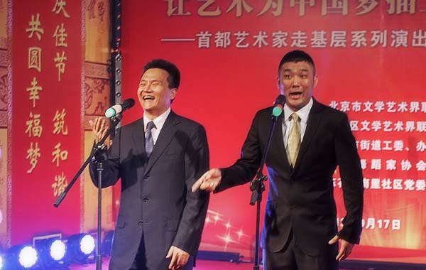 东花市南里社区的“富贵之花”舞蹈队的群舞《我的北京,我的家 》为演出拉开了序幕,优美舞姿为金秋的季节添加了美丽的色彩,在第十三届北京舞蹈大赛中获得金奖的由北京业余中老年追梦艺术团演出的群舞《老来伴》寓意深刻,通过诙谐幽默的肢体语言,充分展现了老年人和谐幸福的晚年生活,舞蹈深深地感动了社区的每位观众;社区歌唱者闫光昊也登台演唱了《好运来》,迎来大家热烈的掌声;由著名评剧表演艺术家戴月琴演唱的《刘巧儿》百姓熟知,大家不由跟随哼唱;由著名相声表演艺术家李伟建、武宾合说的相声《欢声笑语》使观众捧腹长笑;魔术师李学义进入观众当中钓出一条大鱼,使观众惊叹不已;最受观众敬仰的昆曲艺术传承人、我国著名的戏曲表演艺术家、七十五岁高龄的侯少奎先生演唱了《夜奔》选段;由全总文工团男高音歌唱家宫栋才演唱的《我的中国梦》;民乐演奏家姜旭表演的乐器联奏《盛世欢歌》等演出精彩纷呈,近距离向社区百姓展示了艺术的魅力。