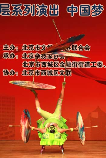 9月17日下午,能容纳1000名观众的中央音乐学院礼堂,座无虚席,人头攒动,来自金融街街道的企业员工和居民朋友们翘首以盼,等待着欣赏节目。在中秋佳节即将到来之季,由北京市文联主办,北京杂技家协会和北京西城区金融街道办事处承办的“让艺术为中国梦插上腾飞的翅膀”首都艺术家走基层系列演出之“中国梦·华韵融通”专场演出在这里激情上演。