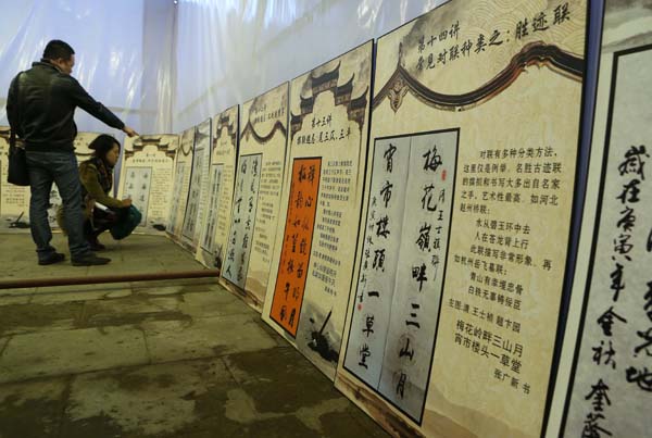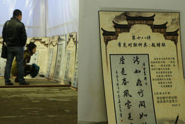 市文联主办的“中国梦,乐在社区”系列公益文化活动之“对联知识和对联书法展览”11月23-27日在北海公园小西天景区大殿举行。此项展览活动于11月15日启动,展览把对联与书法这两项非物质文化遗产结合在一起,不仅展出了著名书法家书写的古代佳联,还有书法家们现场讲解楹联知识,吸引了一大批楹联和书法爱好者观展。展览采取巡展的方式,之前已分别在北京理工大学、天通苑社区各居委会进行了巡展,下一步还将陆续走进八大处公园、柳荫公园以及怀柔、顺义等地,为基层群众进行巡展。