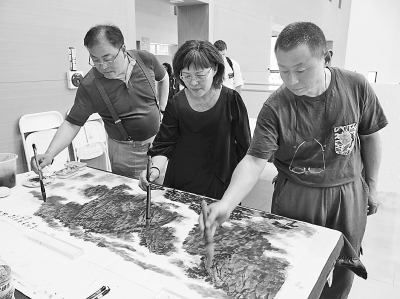 北京美术家协会画家李耀林(左)、张建豹(右)与台湾书画家潘淑梅(中)一起创作《东岳云海》。