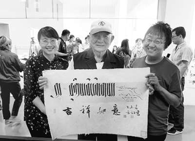 藏文书法家南杰旺扎(右)与书法家方放(左)一起创作藏汉双文“吉祥如意”,赠给祖籍河北正定的87岁老人张玉林。