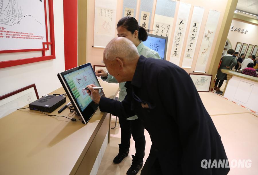 10月14日,第3届北京文学艺术品展示会中华世纪坛开幕。图为市民体验数字书法。