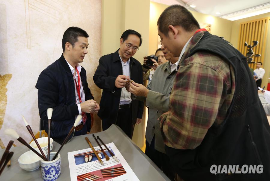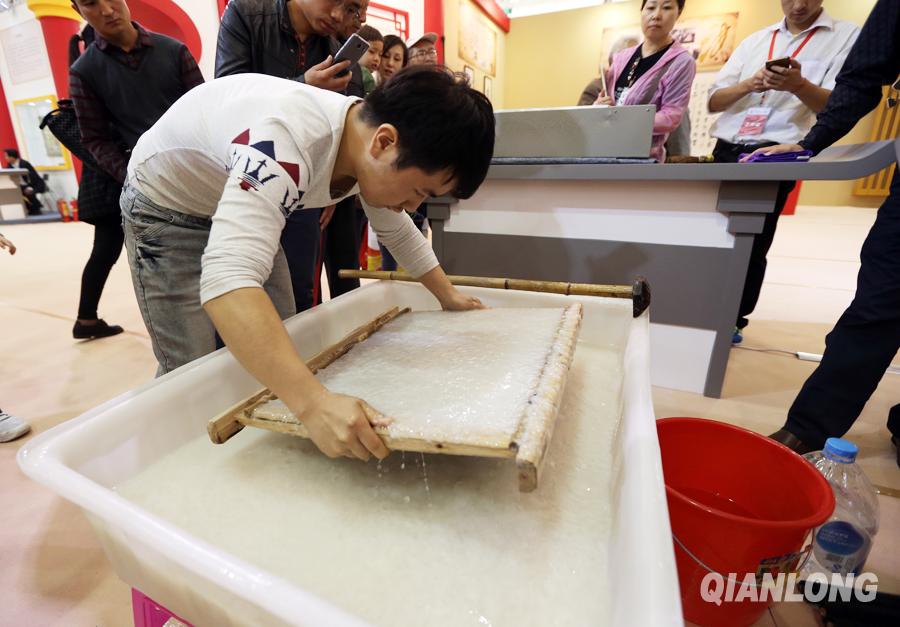 10月14日,第3届北京文学艺术品展示会中华世纪坛开幕。图为工作人员演示宣纸的制造工艺。