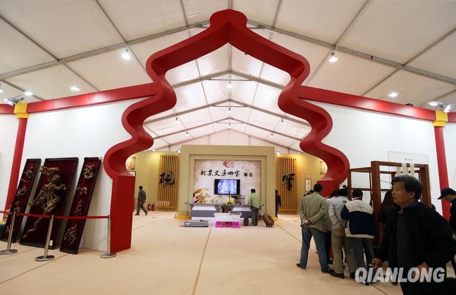 10月14日,第3届北京文学艺术品展示会中华世纪坛开幕。图为展区以天坛为造型突出北京元素。