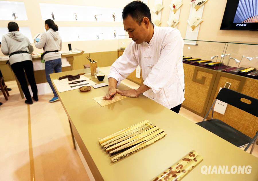 10月14日,第3届北京文学艺术品展示会开幕。图为北京扇子艺术协会会长郑高现场制作折扇。