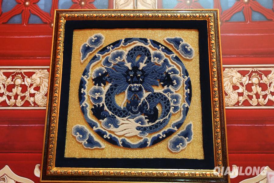 10月14日,第3届北京文学艺术品展示会中华世纪坛开幕。图为现场展出的盘龙宫毯。