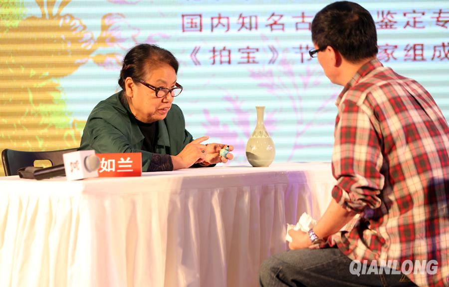 10月14日,第3届北京文学艺术品展示会中华世纪坛开幕。图为知名鉴定专家张如兰现场鉴宝。