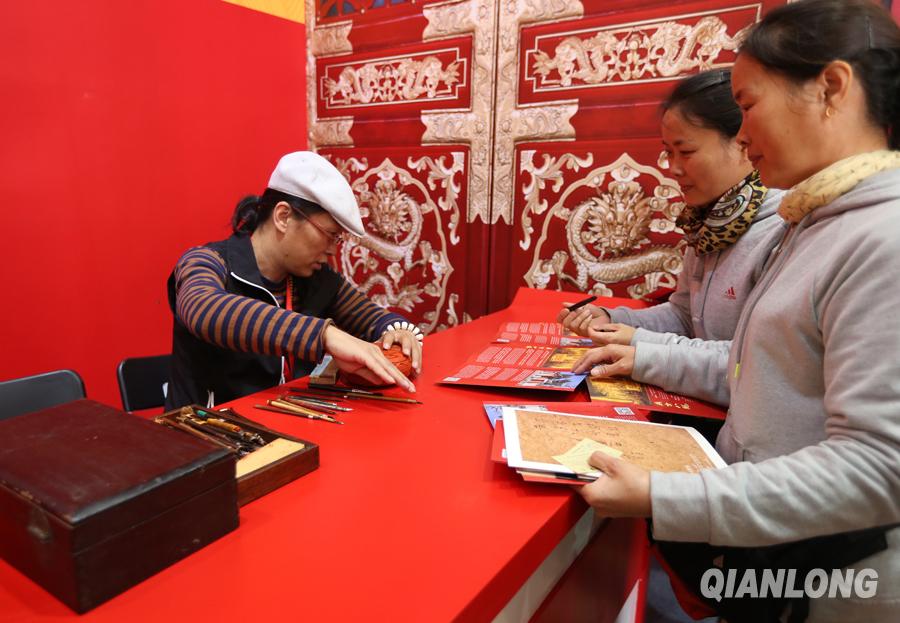 10月14日,第3届北京文学艺术品展示会中华世纪坛开幕。图为宫毯制作现场吸引市民观看。