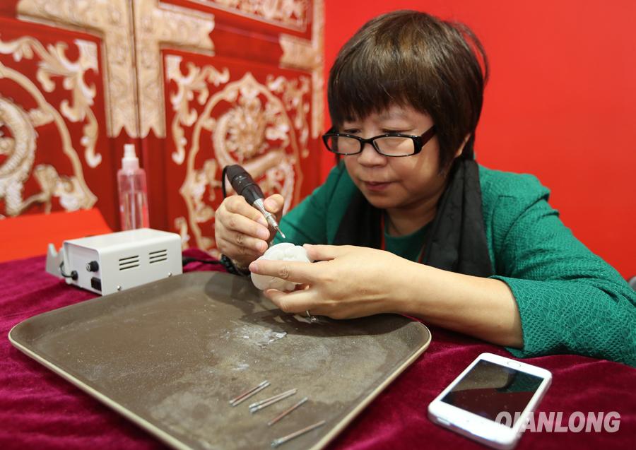 10月14日,第3届北京文学艺术品展示会中华世纪坛开幕。图为玉雕大师王建现场打磨作品。