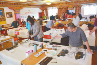 自2012年首都艺术家代表团赴藏开展文化交流慰问活动以来,西藏不仅牢牢地吸引着大批舞台表演艺术家,也同样是书画家心中圣洁的艺术净土。演出同时,来自北京的书画家程茂全、廖廷建、郑轩、窦志强、张建豹、孙晓材、王志学、余光清、郭孟祥与藏族书法家南杰旺扎、索朗旺久等一起挥毫泼墨,共同开展书画创作交流笔会,或互相切磋、或合作书写,并为武警官兵及学生们题字以示激励,用手中的笔墨传递京藏情、共绘中国梦。