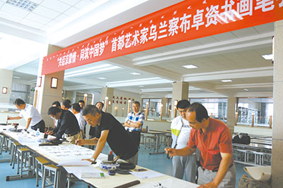 7月10日,大巴车从北京直奔赤峰。当天下午,在赤峰市松山四中没有任何空调和电扇的篮球场内,北京市文联书法家协会和美术家协会的艺术家们冒着39摄氏度高温铺开纸笔,开始了首场创作笔会。