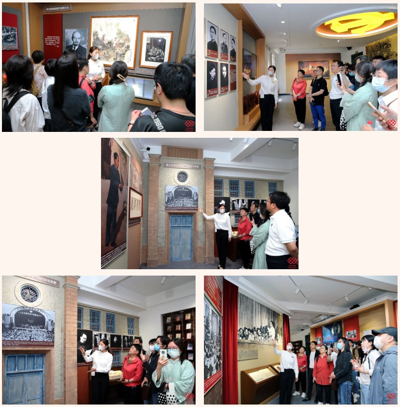 随后来到了中法大学旧址。中法大学前身是民国初期蔡元培先生等人发起组织的留法勤工俭学会创办的法文预备学校。从1920年建校至1950年停办,中法大学始终贯彻执行首任校长蔡元培先生“思想自由,兼容并包”的办学方针,使马克思主义学说在课堂上占有相当重要的位置,师生政治活动较为自由,爱国民主运动活跃,成为中国共产党早期活动地之一。大家在有着百年历史的教学楼中,参观了“马克思主义在中国早期传播专题展”“新时代马克思主义中国化的光辉历程专题展”两个常设展,通过聆听讲解,参阅大量文献文物、图片资料、艺术作品,结合历史场景复原、沉浸式阅读、多媒体影音体验等形式,感知一百年前中国先进分子和热血青年的燃情岁月,追寻马克思主义在中国传播与发展的路径,感悟百年党史蕴含的真理力量。