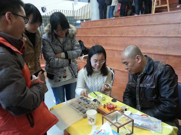 活动现场设置在大学生活动中心,每个艺术家的展台前都被师生们围得水泄不通,大家席地而坐,先听艺术家们的讲解,之后亲自动手体验,现场气氛轻松、和谐。师生们围绕什么是非遗、对申遗的认识、如何保护非遗等一系列问题与艺术家们进行了热烈的讨论,并提出了自己的见解。通过此次展示活动,来自祖国各个地区的大学生们对北京地区民间文艺及风俗文化有一定的了解,对中华民族传统文化有更深的认识。