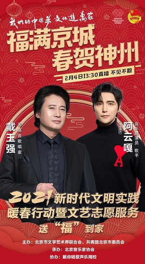 在即将开始的活动中,男高音歌唱家戴玉强、知名音乐剧演员阿云嘎等共计8个艺术门类13位名师,也将通过线上直播及视频展播等形式依次登场,以美好的祝福和精湛的技艺,为首都高校,街道村镇等多个区域的人民群众,送上文艺志愿的定制服务。