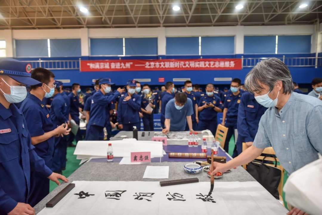 为向党的百年华诞献礼,书画笔会现场,北京书法家协会的5名书法家、北京美术家协会的5名美术家,围绕建党百年、中华优秀传统文化及消防救援等主题,挥毫泼墨、现场创作,让现场观众纷纷驻足、屏气凝神、欣赏学习。