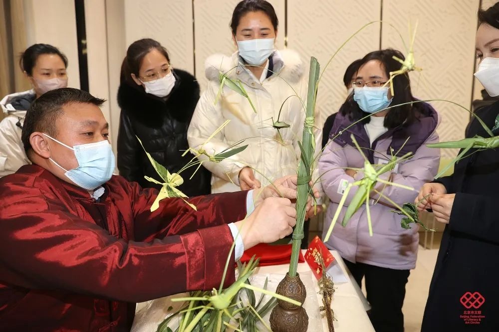 在一幅幅象征祥瑞喜庆的春联中,北京民协厚贵银、张邦喜、尹盼盼3位民间文艺家,也用喜闻乐见的民间艺术佳作,带着大家重温“年味”的温暖。剪纸、糖人、草编、中国结等民间艺术,历史悠久、底蕴深厚,寄托着吉祥和美好。现场观众,纷纷排队参与,“这个能吃吗?”“这是用什么糖熬出来的?”“我想吹一匹奔腾的骏马”,糖人艺术家厚贵银与观众互动,活波的玉兔、奔腾的骏马,健壮的耕牛……瞬间活灵活现的呈现在手中,令人称奇赞叹。