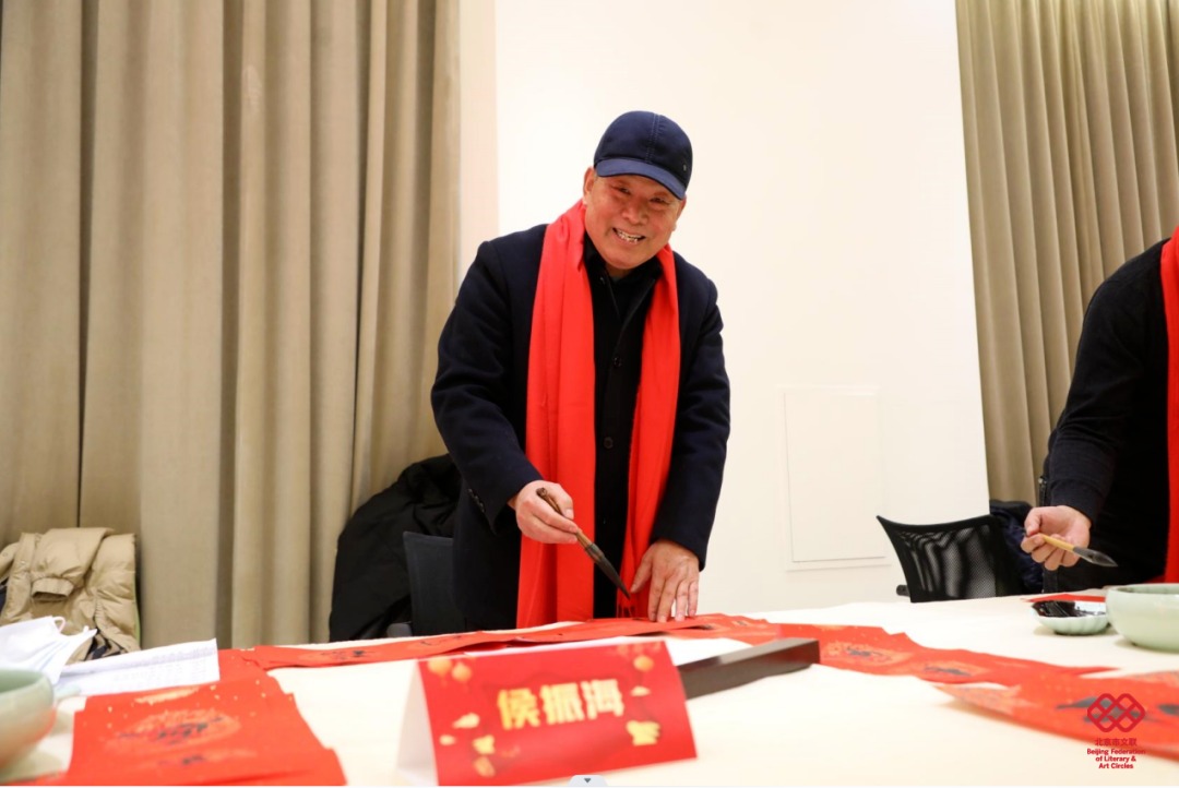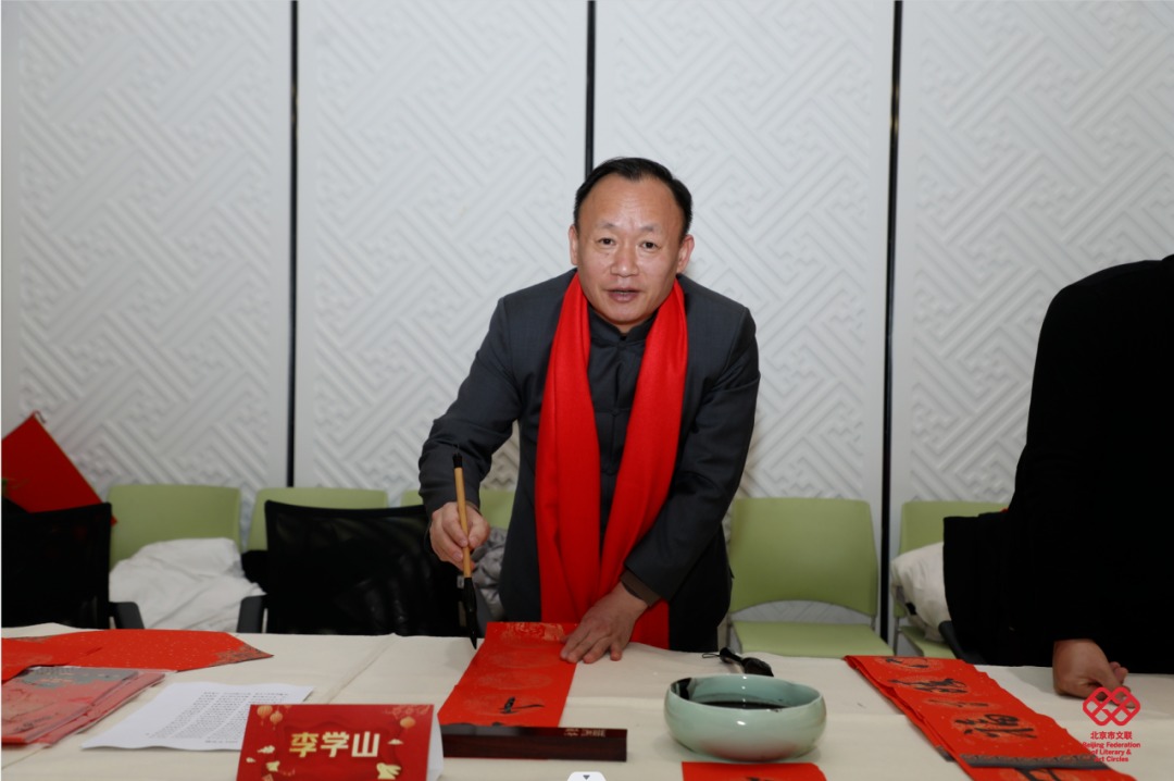 翰墨飘香,送“福”到家。中国书协副主席、北京市文联副主席、北京书协主席叶培贵,中国书协理事、北京书协驻会副主席、秘书长郭孟祥,中国书协理事、北京书协副主席、经开区书协主席刘楣洪,及袁永齐、侯振海、胡文成、王振宇、张平子、赵志清、李学山、陈勇武等11位书法家,笔酣墨饱、伏案疾书。随着毛笔的飘逸游走,“虎步健行中轴线 兔毫畅绘九州春”“诸事平安顺风顺水顺心意 心想事成好年好景好前程”等,一副副寓意吉祥的对联跃然纸上。