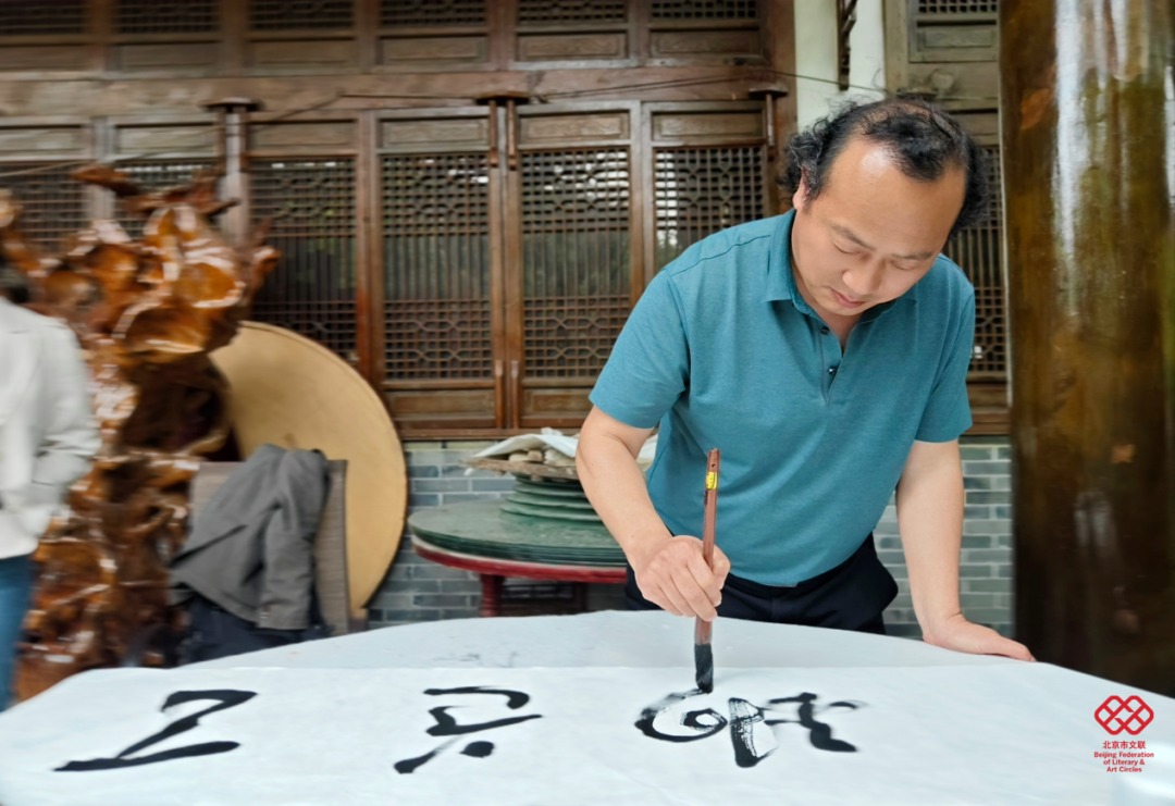 在什邡被中国书协评为“兰亭学校”的双盛初中和双盛小学,北京书协副主席丁嘉耕、理事朱河山、会员徐青锋与当地书画爱好者以笔墨为媒展开交流与讲座。丁嘉耕着重讲解了练习书法时要注意的事项,对如何提高书法鉴赏力也给出诸多建议。现场书写的“道法自然”笔法酣畅,让当地书法工作者品味不已。