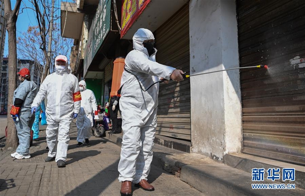 武汉市江岸区花桥街道志愿者在对街区进行消杀作业(2月9日摄)。新华社记者 程敏 摄
