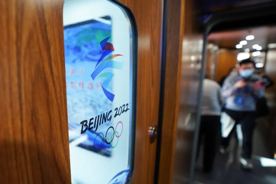这是2022年1月6日在G9981次北京冬奥列车内拍摄的北京2022年冬奥会会徽。新华社记者 鞠焕宗 摄