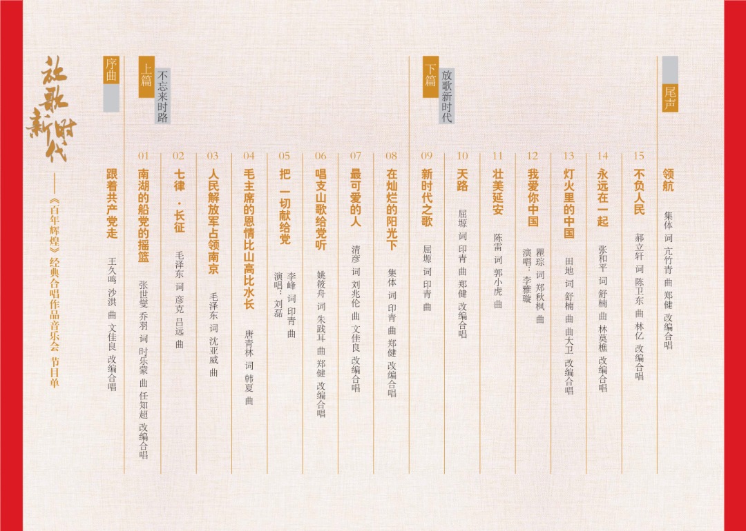 第四篇章:惊天动地 选曲新时代新创作曲目《灯火里的中国》《新时代之歌》、2022北京冬奥会《永远在一起》、北京音协新创作《不负人民》等时代金曲。
