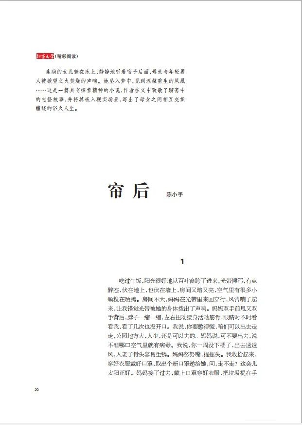 在讨论新北京作家群写作的问题意识和视野之前,首先需要对新北京作家群做一个稍微严格一点的界定。目前对新北京作家群的认定基于两点区别,第一点是区别于“旧北京作家群”,这里面临的问题是所谓的“旧北京作家群”也是一个宽泛且模糊的指认,一些批评家的文章将这一群体上溯到了民国时期的“京派”,并根据时间的顺序将老舍、邓友梅、刘心武、叶广芩、王小波、史铁生、刘恒等等都囊括在内。新北京作家群则指的是一批出生于20世纪70年代、80年代甚至是90年代这三个代际的作家群体。第二点是,在谈到“旧北京作家群”的时候,往往会强调“出生在北京的作家以北京话写北京发生的故事”这一点,而对新北京作家群的写作则没有这么严格的要求。从《北京文学》“新北京作家群”专栏发表的作品来看,既有出生于北京的作家,也有出生于外地的作家;语言上会偶有北京方言,但大多是一种标准的普通话写作;内容上既写在北京的故事,也写在外地发生的但与北京有一定联系的故事。