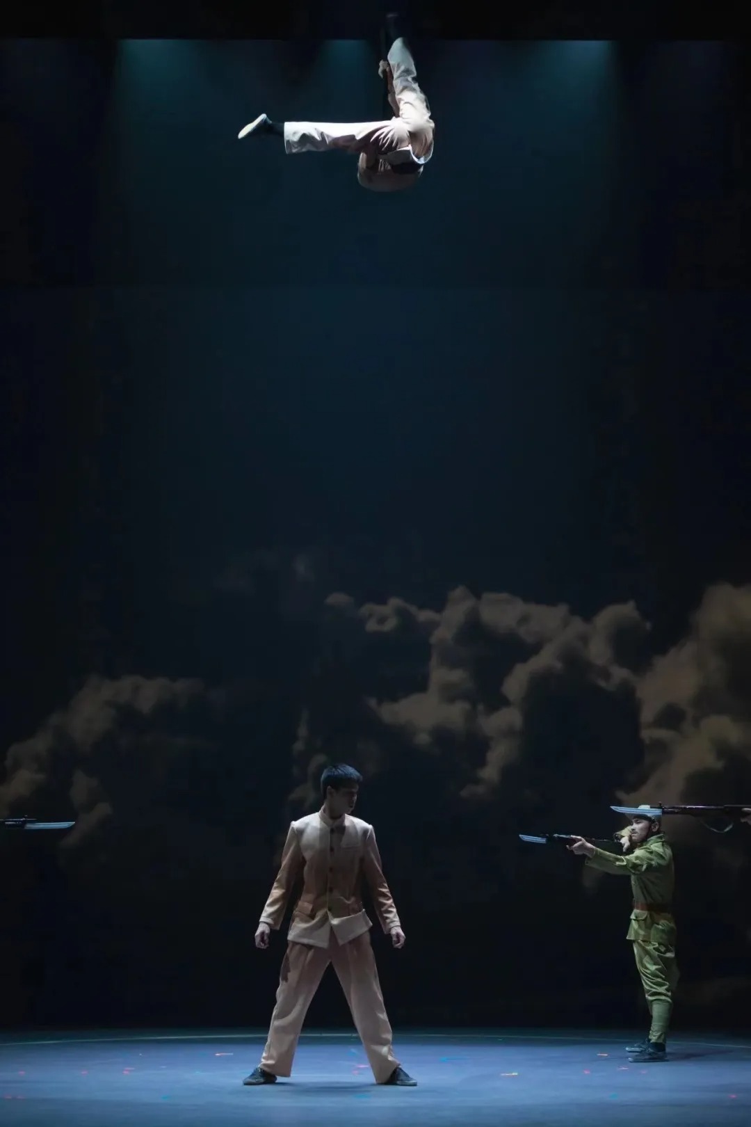 在敌人抓捕我方人员的片段中,我方人员为掩护战友,经过激烈的周旋,寡不敌众最终倒在了敌人的刺刀下,这一段的杂技动作不难,更多的是需要演员将敌我力量悬殊,舍我其谁,不怕牺牲的革命精神通过演员在表演中展示的强烈信念感,有血有肉地将人物呈现在舞台上,让观众相信在革命战争年代,很多这样的英雄和勇士确实为取得抗战胜利献出了宝贵的生命。《永定山河》中的10余位年轻演员做到了,他们用可圈可点的演技为观众呈现了一幅战火纷飞的年代,爱国青年蓬勃向上的时代图景。