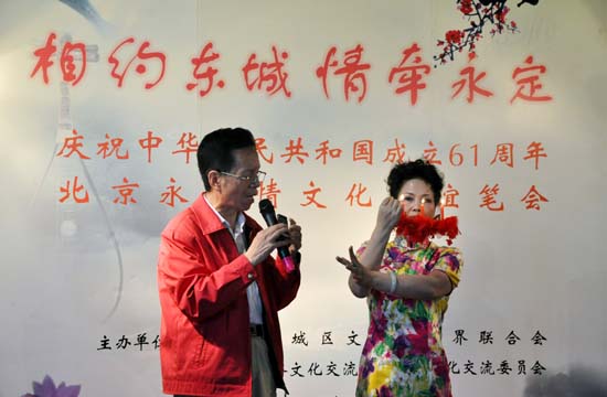 为庆祝中华人民共和国成立61周年,继承和弘扬中华民族优秀传统文化,展示新东城艺术家风采,9月28日下午,东城区文联、中国社会经济对外文化交流协会国际文化交流委员会在永定门城楼共同举办“相约东城 情牵永定——庆祝中华人民共和国成立61周年北京永定情文化联谊笔会”活动。