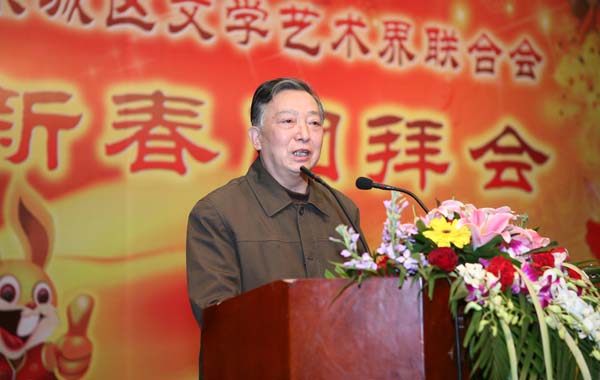 团拜会在热烈、祥和、喜庆的气氛中进行。区文联党组副书记、常务副主席王富国作区文联2011年工作安排汇报。北京市文联副主席、区文联主席赵书致欢迎辞,代表区文联对到场的领导和嘉宾致以节日的良好祝愿,并以“天时”、“地利”、“人和”来形容当前东城区广大文艺工作者所处的时代背景和创作环境,鼓舞广大文艺工作者认清自己所肩负的使命与责任,为推动文学艺术事业的繁荣和发展多做好事、做实事。