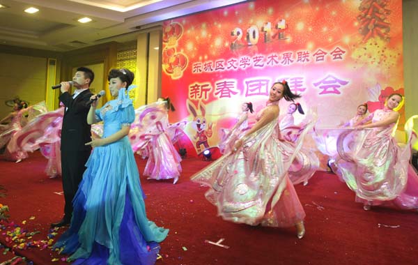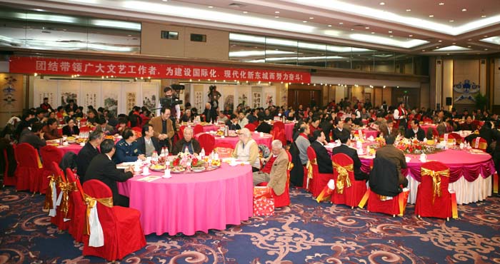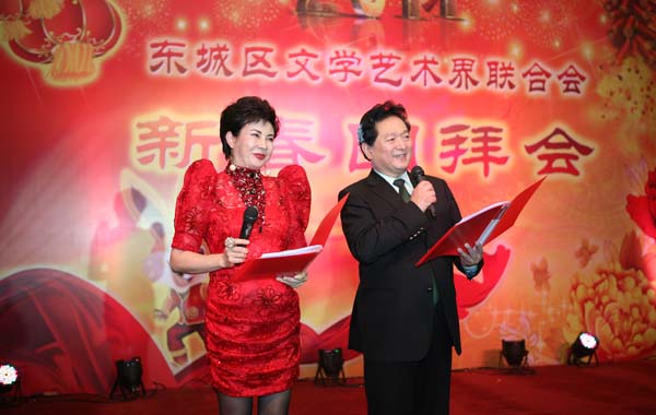 1月26日下午,首都大酒店紫云厅里欢歌笑语、暖意融融,东城区文联2011年新春团拜会在这里隆重举行。中国音乐学院名誉院长、北京市文联主席金铁霖,北京市文联党组书记、常务副主席朱明德,北京市文联党组副书记、驻会副主席黎晶,北京市文联党组副书记王德新,北京市文联副主席、东城区文联主席赵书,东城区委书记杨柳荫,东城区区长牛青山,东城区人大常委会主任冯熙,东城区政协主席徐鸿达,东城区委副书记常卫,东城区委常委、宣传部部长赵中原,东城区委常委、区委办主任夏树军,东城区副区长毛桂芬,东城区政协副主席刘忠胜共同出席活动。市文联有关部门、区县文联及部分区属单位负责同志,区文联顾问、副主席及各艺术家协会代表近400人欢聚一堂,畅叙友情,共迎2011年新春。