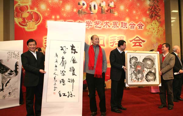 北京市文联党组书记、常务副主席朱明德,北京市文联党组副书记、驻会副主席黎晶,著名书法家张仲愈,著名画家吴东魁分别向东城区四套班子赠送了各自创作的书画作品;东城美术家协会向区文联赠送了画家集体创作的山水画《晴川揽胜》。
