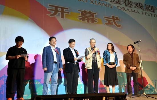 东城戏剧家协会副主席、著名演员史可担任开幕式主持人。东城区区长牛青山、市文联党组书记朱明德、市文化局副局长吴然分别致辞。牛青山区长在致辞中表示,东城区未来将进一步加大力度扶持戏剧文化发展,积极搭建戏剧创作、演出、展演三大平台,推动戏剧文化国际交流合作,吸引更多的优秀艺术家汇聚东城,积极推动戏剧公益事业和产业发展,努力把东城建设成为一流的戏剧文化繁荣之区。朱明德书记代表北京市文联祝愿南锣鼓巷戏剧节越办越好,希望戏剧创作者更多地投身到火热的现实生活中去,推出更多更好的原创作品。吴然副局长指出,南锣鼓巷戏剧节是东城文化的一大亮点,希望南锣鼓巷地区今后逐步发展成为能媲美纽约百老汇、光照一片的戏剧文化街区。