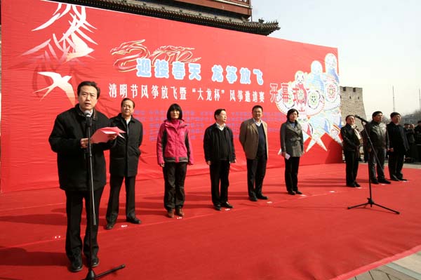 为弘扬中华民族传统文化和北京精神,展现首都民间技艺风采,促进与兄弟省市民间技艺交流,营造清明传统节日氛围,4月1日上午,“迎接春天 龙筝放飞”——清明节风筝放飞暨“大龙杯”风筝邀请赛在永定门城楼广场开幕。北京市文化局副书记、副局长何昕,北京市文化局非遗处处长、北京非物质文化遗产保护中心主任千容,青岛市文联组织联络部部长仇玲,东城区委常委、区委宣传部部长金晖,东城区委常委、副区长朴学东,区文委主任李承刚,区文联常务副主席王富国,中国北京同仁堂集团有限责任公司党委副书记陆建国,大龙集团董事长丁建国等领导和嘉宾,以及来自北京、天津、河北、山东等地的近200名风筝爱好者参加活动,共同感受现代清明的文化魅力。