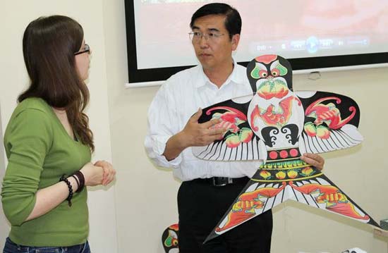 吕铁智先生向外国学生讲授中国风筝制作技艺