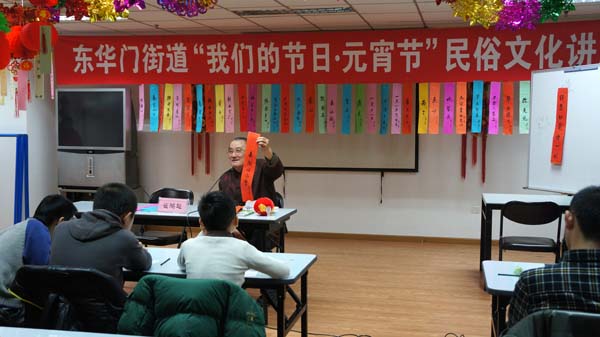 在元宵佳节即将到来之际,为营造欢乐喜庆、文明祥和的节日气氛,推动文艺工作深入百姓、深入社区,2月20日下午,东城区文联邀请了民俗专家翟鸿起,为东华门地区的60多名青少年作了“趣谈字谜”的民俗知识讲座,广大青少年兴致勃勃地竞相猜谜,现场气氛十分活跃。