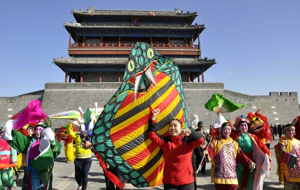 东城区文联常务副主席王富国主持活动开幕式。金晖部长致辞。老北京民间花会表演拉开了活动的序幕。风筝爱好者们在广场上同时放飞起花样繁多、扎技精湛、造型丰富的风筝,其中还有特别为蛇年制作的蛇形风筝,寓意“金蛇狂舞”。各种彩画风筝如一幅幅美丽的图画,装点着初春北京的天空。众多风筝爱好者和社区群众到场观看风筝放飞,使清明节再现出人与自然和谐相处的丰富内涵。